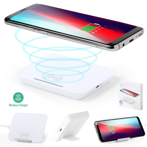 Cargador inalámbrico con función soporte de smartphone. De sobrio diseño monocolor en blanco, con cable de carga micro USB incluido. Compatible con dispositivos equipados con tecnología de carga inalámbrica. Presentado en atractiva caja de diseño. Inalámbrico 5W