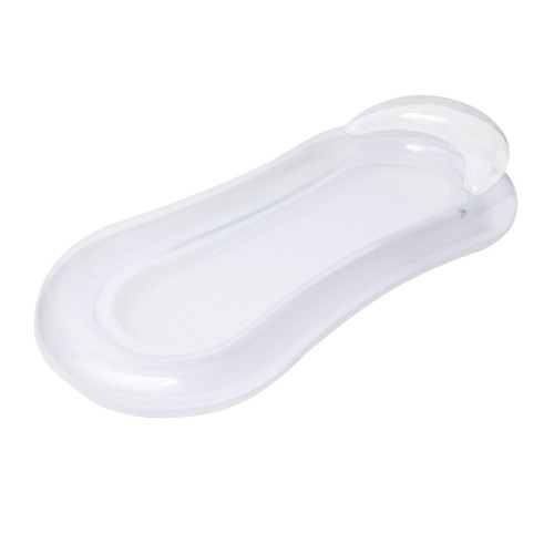 Original colchoneta en resistente PVC. Incluye una cómoda almohada para la cabeza, con diseño bitono, en colores transparente y blanco. Incluye una resistente redecilla central en poliéster de color blanco. Con plegado especial para fácil impresión. Se sirve desinflada y en una práctica bolsa individual reciclada. Plegado Especial para Impresión