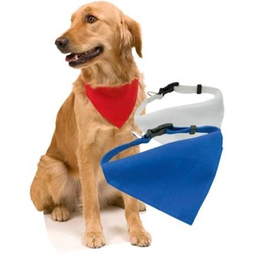 Collar bandana para mascota en resistente y suave poliéster de vivos colores. Con cinta ajustable de cierre de clic y accesorio metálico para cinta de paseo. Ajustable