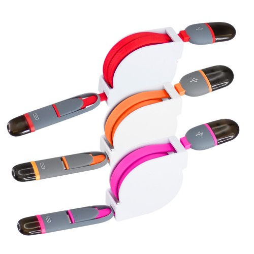 Connect Multicargador Retráctil, con cable de 1m de plástico engomado TPE de color, terminales de carga USB y Micro USB / Lightning / Type C. Incorpora nueva tecnología de cable cargador dual Micro USB y i-phone (en el mismo terminal). Compatible con dispositivos Android, Apple y Type C. Soporte plástico ABS blanco con amplia área de impresión. Presentación en elegante bolsa OPP con orificio para ganchera. Producto con aprobación CE, ROHS, FC.