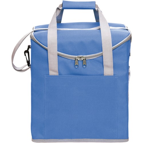 30 x 34 x 19,5 cm. Capacidad 37 litros. Poliéster. 600D Lonchera térmica con recubrimiento interior metalizado. Un bolsillo frontal y dos bolsillos laterales de red. Correa tipo bandolera y dos manijas reforzadas con cierre de velcro. Capacidad hasta 6 botellas de 2,5 litros
