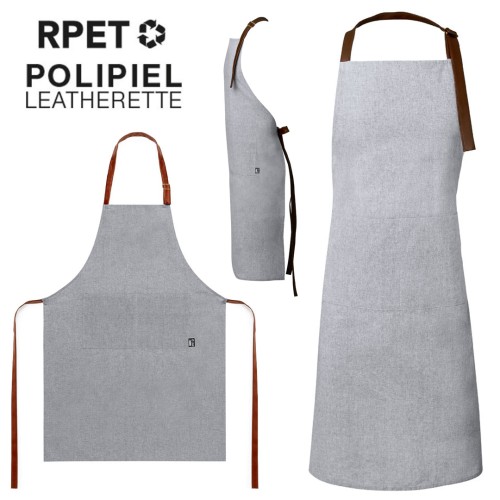 Delantal de línea nature en material RPET, elaborado a partir de plástico reciclado, para así fomentar la reutilización de residuos plásticos y ayudar a la sostenibilidad del planeta. De corte por debajo de la rodilla, con cintas de ajuste en resistente polipiel y amplio bolsillo frontal. Etiqueta en bolsillo con distintivo RPET.