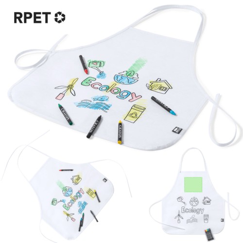 Delantal fabricado en non-woven RPET de color blanco, especialmente diseñado para colorear con ceras. Incluye 5 ceras en variados colores. Con cintas de ajuste en cuello y cintura. Distintivo RPET en etiqueta exterior.El material RPET se elabora a partir de plástico reciclado, para así fomentar la reutilización de residuos plásticos y ayudar a la sostenibilidad del planeta. Talla Única. Niño. 5 Ceras Incluidas