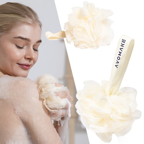 Suave esponja de baño en fibra de PE, con cinta de sujeción a juego y amplia superficie de marcaje.
