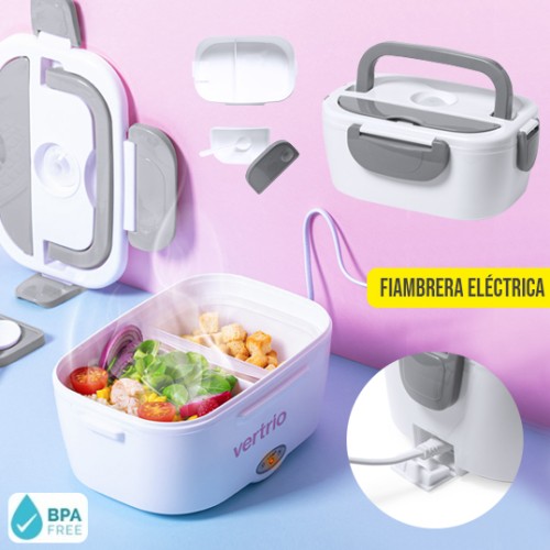 Fiambrera eléctrica de 1l de capacidad . Fabricada en resistente ABS libre de BPA y en diseño bicolor. Incluye práctica asa de transporte y tapa hemética con cierres de seguridad laterales. 2 compartimentos principales y compartimento auxiliar con cierre hermético. Cuchara incluida, con cable de alimentación para enchufe europeo. Ideal para calentar la comida en la oficina. Presentada en atractiva caja de diseño. 1 L