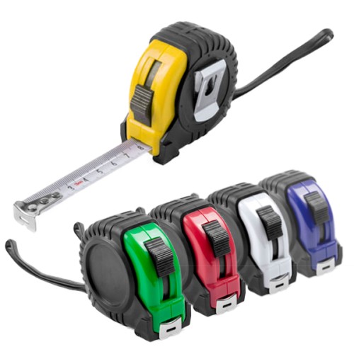 Flexómetro de 3 metros con cuchilla metálica y mecanismo de bloqueo. Con cuerpo de suave acabado en variados colores, recubierto con funda protectora de resistente goma, clip metálico para cinturón y cinta de transporte. Con troquelado especial para marcaje en doming/gota de resina y presentado en caja individual. Con Freno y Clip Incluido