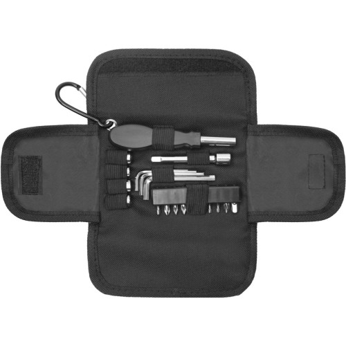 15 x 9,5 cm (cerrado) 15 x 23,5 cm (abierto). Acero y plástico. Set de herramientas de 19 piezas. Destornillador con 10 puntas diferentes, 3 llaves Allen, 4 llaves tubo de 4 medidas y alargue. Estuche con cierre de velcro y gancho.