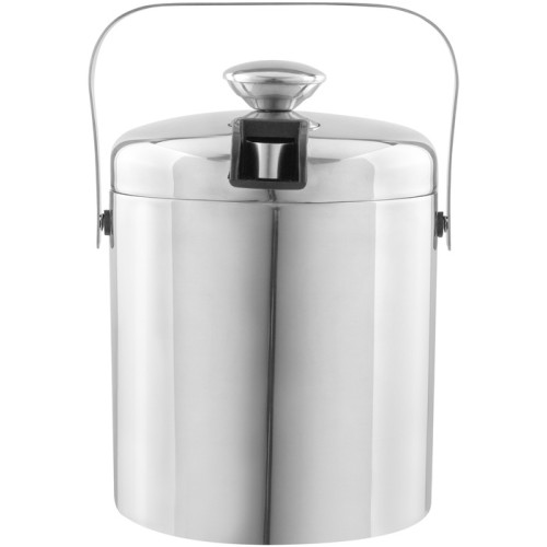 Ø 14 x 14 cm. Capacidad 1100 ml. Acero inoxidable. Interior en acero 304 y exterior en acero 201. Hielera de mesa con tapa. Pinza para hielo de acero inoxidable, encastrable en la misma tapa. Asa de acero inoxidable para transportar. Presentación en caja de regalo kraft.