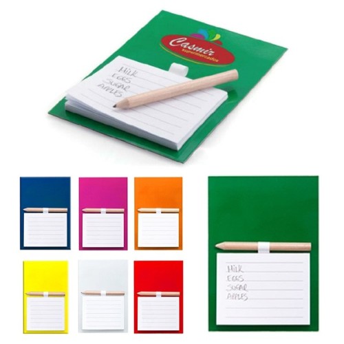 Imán bloc de notas en resistente cartón de vivos y variados colores. Bloc de 40 hojas de distribución a una raya con soporte para minilápiz -incluido-. Bloc 40 Hojas. Lápiz Incluido