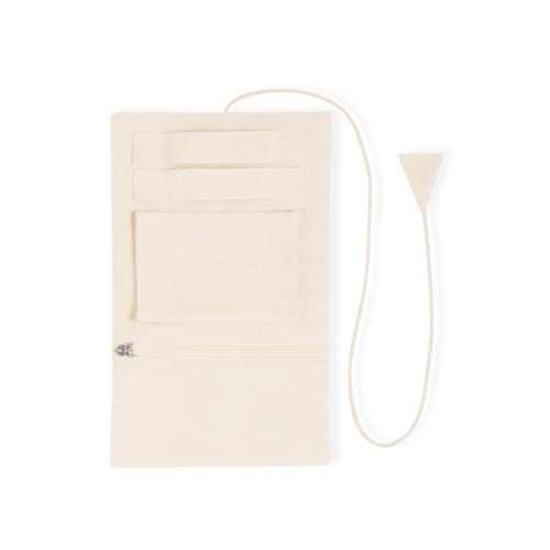 Joyero plegable fabricado en algodón, para guardar preciados artículos personales. Confeccionado en 3 partes de color natural: parte superior con cintas, parte central con bolsillo y parte inferior con bolsillo de cremallera, pudiendo plegarlo y sujetarlo firmemente con su cordón a juego.