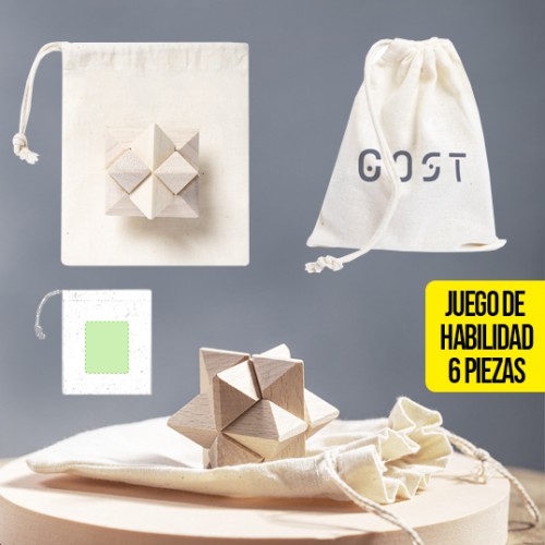 Juego de habilidad de 6 piezas para los más sesudos, presentado en una resistente funda de algodón con cierre de cordón. 6 Piezas. Funda Algodón