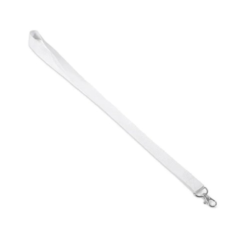 Cinta porta credencial blanca de poliéster con gancho metálico, fabricada en poliéster y aleación de zinc. Cuenta con doble mosquetón metálico resistente que asegura credenciales e identificaciones de manera práctica y segura. Es ideal para empresas, instituciones educativas, ferias, congresos y todo tipo de eventos donde se requiera portar identificación visible.