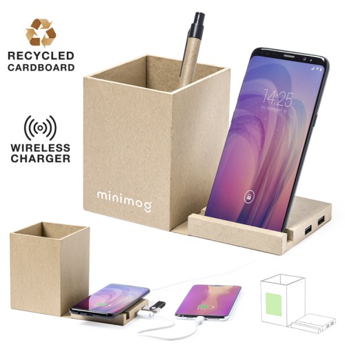 Lapicero multifunción 4 en 1 de línea nature fabricado en cartón reciclado, contribuyendo a la conservación de los bosques y reduciendo considerablemente la huella de carbono. Con funciones lapicero, soporte para smartphone, cargador inalámbrico y puerto USB (2xUSB 2.0). Diseño plegable con ajuste magnético. Compatible con smartphones con tecnología de carga inalámbrica. Incluye cable micro USB en color blanco de 1 metro de largo. Presentado en atractiva caja de diseño eco, con manual de instrucciones en español e inglés. Inalámbrico 5W. 2 Puertos. USB 2.0
