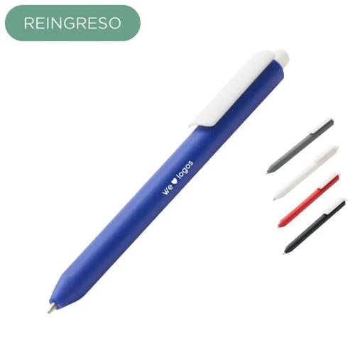 Lápiz confeccionado en ABS, con clip en color blanco. Apertura con pulsador retractil. Tinta azul.