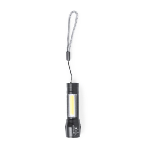 Potente linterna con batería recargable, fabricada en aluminio de acabado en color negro. Luz frontal con 1 LED y cabezal regulable, para tener un enfoque más focalizado o abierto. Además, cuenta con 10 luces COB en el mango y tres modos de iluminación (fija e intermitente de dos velocidades), incluye cinta de trasporte. Se alimenta mediante una batería recargable de 400 mAh, incluido cable micro USB. Presentada individualmente en caja de diseño. 1 Led. 10 Luces COB. 2 Posiciones de Luz, Fija e Intermitente. Batería 400 mAh