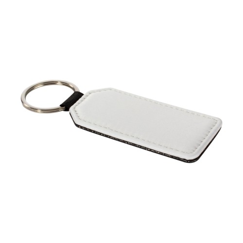 Llavero rectangular con forma "bandera" de PU blanco para sublimación. Reverso capa PU negro con brillo (no sublimable). Argolla de Acero inoxidable.