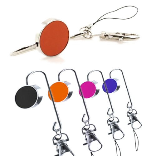 Llavero cuelgabolsos metálico con corona en polipiel de vivos colores. Con cinta de transporte de cierre de mosquetón. Presentado en estuche individual.