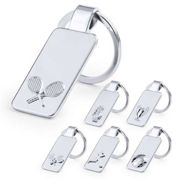 Llavero metálico en acabado plateado brillante con multitud de diseños deportivos en relieve. Presentado en estuche individual negro con troquelado y acabado en antelina.