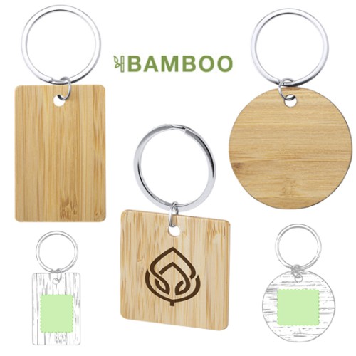 Llavero de línea nature fabricado en bambú, disponible en diseños circular, cuadrado y rectangular.