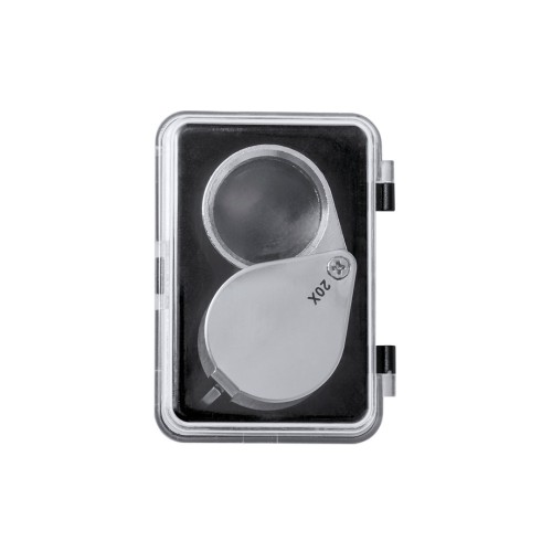 Lupa plegable con aumento 20x fabricada en resistente metal. Gran potencia de aumento para obtener una visión muy cercana de los detalles más pequeños, con ampliación sin distorsión. Ideal para inspeccionar objetos de tamaño reducido, textos, etc. Además, tiene un accesorio para colgar y viene dentro de un estuche con interior acolchado para una mayor protección. Presentada en caja de cartón negra.