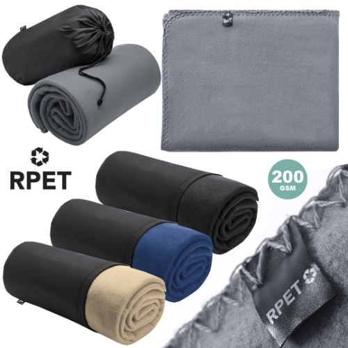 Manta de 120x150cm en variada gama de vivos colores. En material polar fleece RPET de 200g/m2, elaborado a partir de plástico reciclado para así fomentar la reutilización de residuos plásticos y contribuir a la sostenibilidad del planeta. Disponible en variada gama de colores, con funda de cierre de cordón en RPET y distintivo en etiquetas. Funda Poliéster RPET
