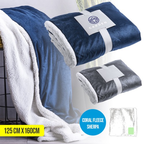 Manta en elegante diseño bicolor de 125x160cm. En suave y cálida combinación de materiales coral fleece y sherpa de 380g/m2. Presentada en cinta con lámina para fácil impresión.