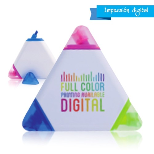 Original marcador fluorescente de tres colores con cuerpo triangular en suave acabado brillante de color blanco, especialmente diseñado para marcaje digital a todo color. Con capuchas translúcidas juego con marcador. Escritura 3 Colores