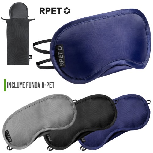 Máscara de viaje de suave y confortable ajuste, disponible en variada gama de colores. Fabricada en RPET, con doble elástico de sujeción y presentada en funda individual a juego de RPET con cierre de cordón. Distintivo RPET en máscara y funda.El material RPET se elabora a partir de plástico reciclado, para así fomentar la reutilización de residuos plásticos y ayudar a la sostenibilidad del planeta. Funda Poliéster RPET