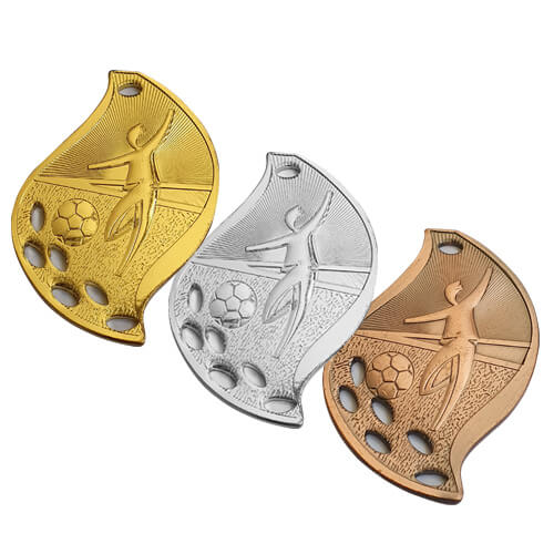 Medalla con forma de hoja de 60x45mm para reconocimiento con diseño fútbol.