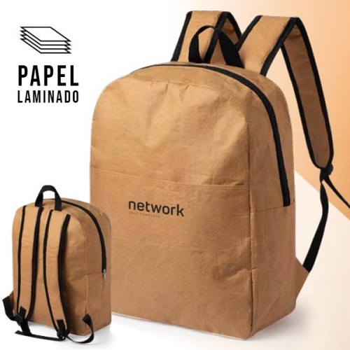 Innovadora mochila en papel laminado ultra resistente de 130 g/m2, resistente a las salpicaduras de agua. Con cierre de cremallera, bolsillo en frontal y bolsillo lateral de gran capacidad. Asa de transporte y accesorios en color negro, con cintas de hombros acolchadas y ajustables. Cintas Acolchadas
