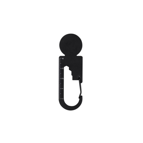Multiherramienta de acero inoxidable y acabado negro mate. Diseñada para adaptarse a múltiples necesidades, incluye 8 funciones: llave para tuercas hexagonales en varios tamaños, regla para mediciones, abrebotellas, moneda para carro de compra, etc. Con cierre de mosquetón. 8 Funciones