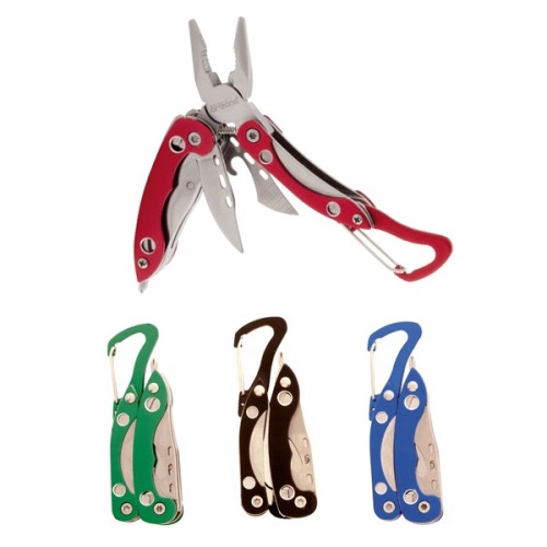 Multiherramienta de orizons con accesorios de acero inox de 6 funciones y mango de aluminio en vivos colores. Con alicates, navaja, abrelatas con destornillador de punta plana con función abrebotellas, destronillador de punta de estrella y mosquetón de acople. Presentada en atractiva caja de diseño con logotipo de la marca. 6 Funciones