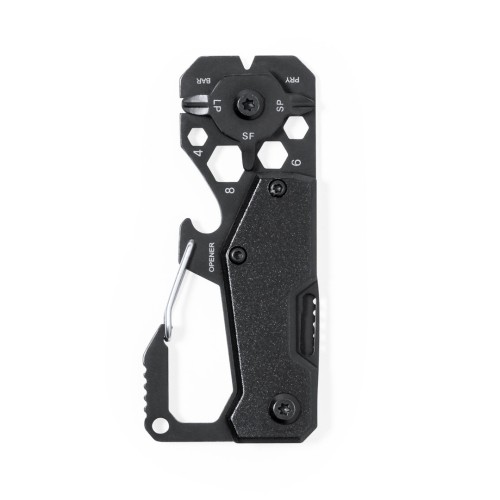 Excelente multiherramienta fabricada en aluminio y acero inox con acabado en color negro. Incluye 13 funciones diferentes: llave para tuercas hexagonales en varios tamaños, mosquetón, abrelatas, regla, rasqueta, cuchillo, destornilladores planos y philips. Presentada en caja de diseño kraft. 13 Funciones