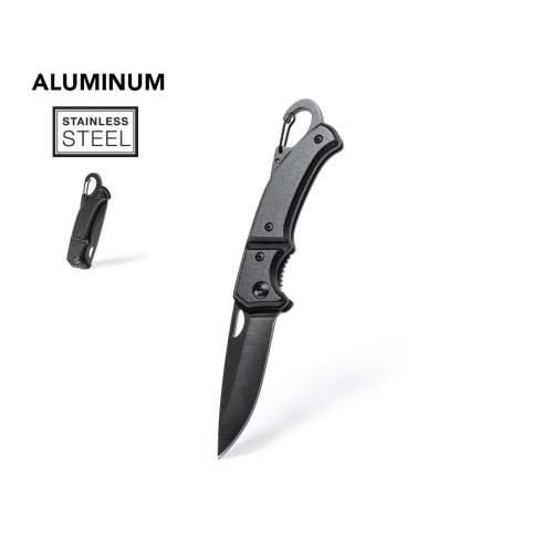 Navaja con hoja en acero inox de acabado negro y resistente empuñadura a juego en aluminio. Con mosquetón integrado en mango y bloqueo de seguridad. Con troquelado en hoja para una fácil apertura y presentada en caja individual de diseño negra. Con Bloqueo
