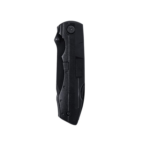 Navaja multiusos de acabado negro en acero inoxidable y resistente empuñadura a juego en aluminio. De diseño plegable y tamaño compacto. Incluye 10 funciones: - Destornillador con múltibles cabezales- Cuchillo de filo liso y dentado-Abrebotellas- Abrelatas- Alicates con cortador de hilosPresentada en práctico estuche de poliéster a juego con accesorio para cinturón. 10 Accesorios. 10 Funciones. Funda Poliéster