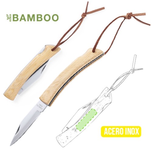 Navaja de línea nature con hoja de acero inox y resistente empuñadura de bambú con bloqueo de seguridad. Con cinta para transporte en polipiel y presentada en caja individual. Con Bloqueo