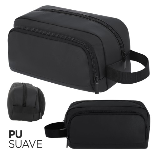 Neceser multiusos en suave PU. Bolsillo principal y bolsillo frontal, con cierres de cremallera y tiradores metálicos. Y práctica asa de mano para un cómodo transporte.