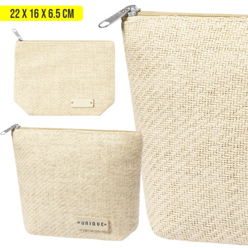 Neceser en material sintético, con cierre de cremallera y tirador metálico. Con superficie para personalización en madera, especialmente diseñada para marcaje en láser.