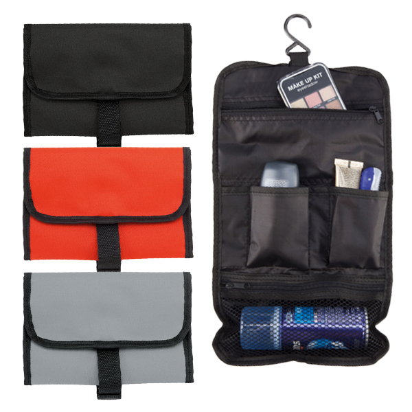 Práctico neceser con percha para colgar en resistente poliéster 600D de vivos colores con ribete de refuerzo en color negro. Bolsillo exterior de cremallera y cierre regulable de clic. Forro interior en suave poliéster con diseño multibolsillo y compartimento de redecilla.