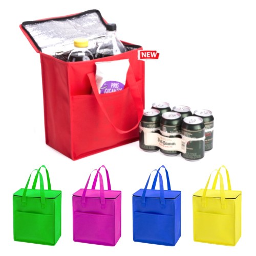 Práctica nevera confeccionada en non-woven con interior de aluminio. Con capacidad de 9,5L y un útil bolsillo exterior, fácil de transportar gracias a sus asas. Tapadera con cierre de cremallera y gran resistencia hasta 5 kg de peso. Disponible en una variada gama de colores.