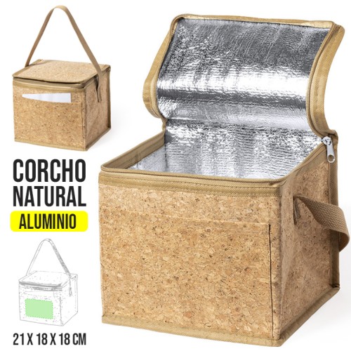 Nevera de línea nature con capacidad para 6 latas. Fabricada en corcho natural con interior isotermo acabado en aluminio. Cierre de cremallera y asa de transporte a juego. Incluye bolsillo exterior con amplia superficie de marcaje.