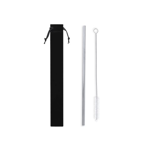Juego de pajita reutilizable en acero inox. Con accesorio cepillo limpiador incluido y presentada en estuche de suave microfibra con cordones ajustables para mejor cierre.