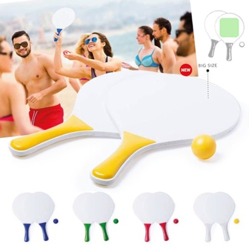 Par de palas de playa en madera natural blanca. Con mango reforzado en variada gama de vivos colores. Presentadas en bolsa redecilla con pelota a juego.