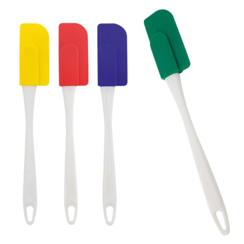 Paleta de cocina con extremo de silicona en vivos colores y confortable mango ergonómico con troquelado para colgar.