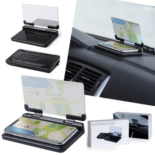 Pantalla soporte para automóvil. Con espejo duplicador de imagen ajustable y superficie anti deslizante ultra adherente para salpicadero y smartphone. Presentado en atractiva caja de diseño. Superficie Adherente