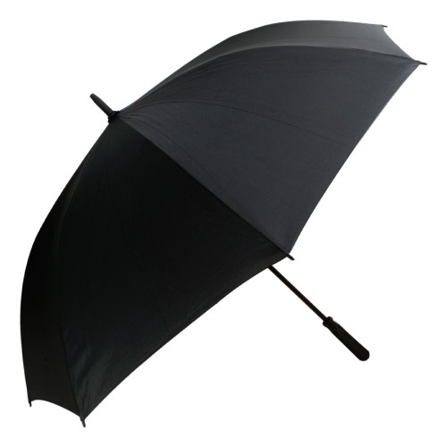 Paraguas ejecutivo grande, con 8 cascos de tela 190T PONGEE, reverso UV. Contiene varas reforzadas Anti-Vuelco de Fibra de Vidrio color negro y sistema de apertura automático. Mango recto de EVA negro. Incluye funda al tono de 190T PONGEE.
