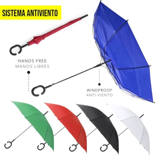 Paraguas de 8 paneles en extensa gama de vivos colores y 105cm de diámetro. De apertura automática, con sistema antiviento y en resistente material poliéster. Con varillas de fibra en color negro y original mango manos libres. 23"". Automático. Sistema Antiviento
