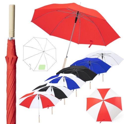 Paraguas de 8 paneles en nylon 190T, de 105 cm de diámetro. Apertura automática, con varillas metálicas en color cromado y mango de madera. Disponible en variada gama de colores planos o combinaciones con blanco. 23"". Automático. Mango Madera
