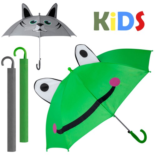 Paraguas infantil con divertidos diseños de gato y rana. De 78cm de diámetro y fabricado en resistente material poliéster 180T. Apertura automática, con caña y varillas de metal, mango curvo y funda de poliéster a juego. 18". Automático. Funda Poliéster