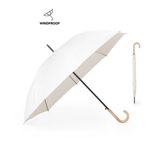 Paraguas de 8 paneles y 120 cm de diámetro, en resistente material pongee 190T de acabado natural. De apertura automática y mecanismo antiviento. Con varillas de fibra en negro, mango de madera y tira con cierre de velcro. 27"". Automático. Sistema Antiviento. Mango Madera